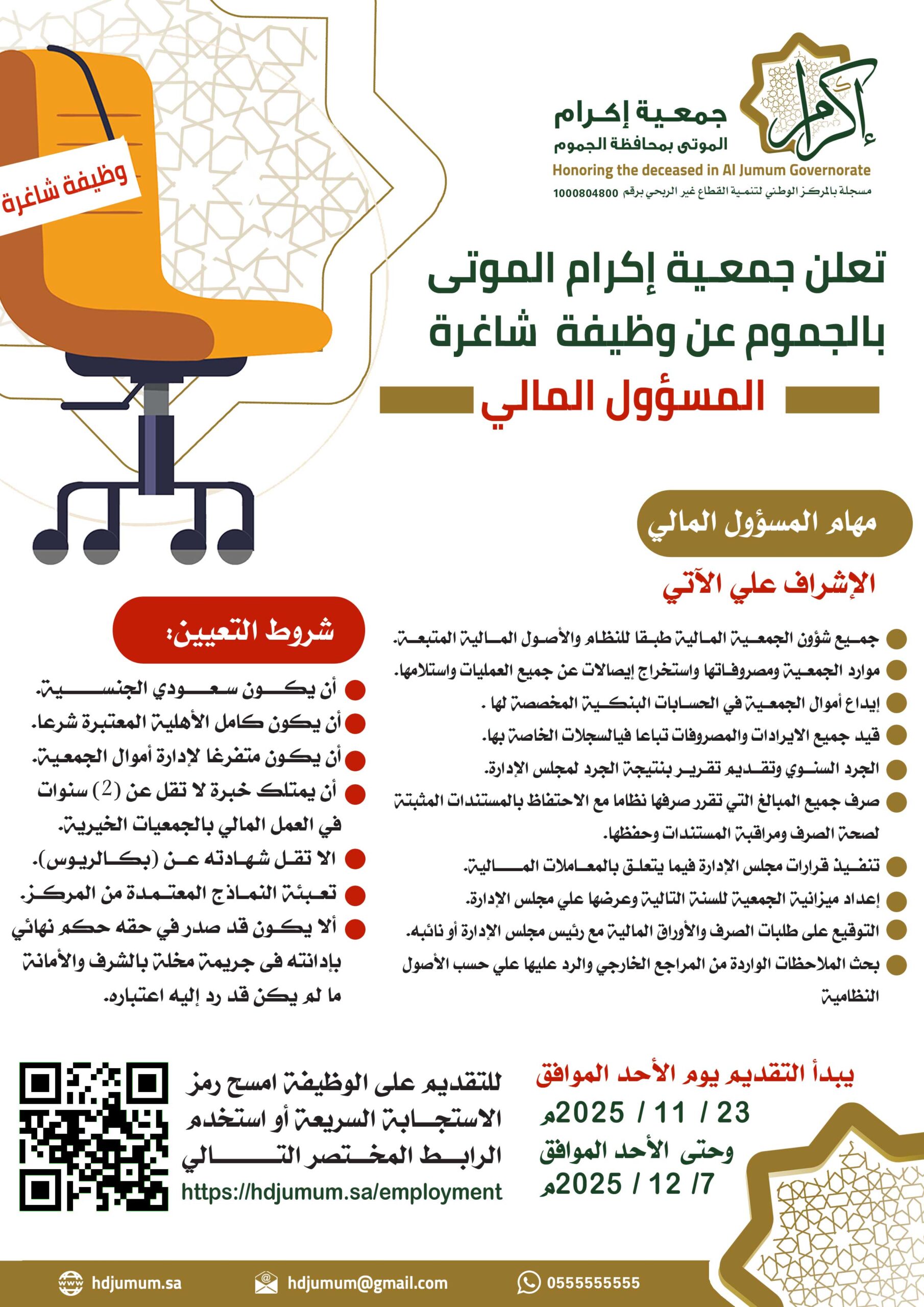 تعلن جمعية إكرام الموتى بمحافظة الجموم عن وظيفة مسؤول مالي شاغرة وعلى من يأنس في نفس الكفاءة التقديم لشغل الوظيفة وفق الرابط في الاعلان